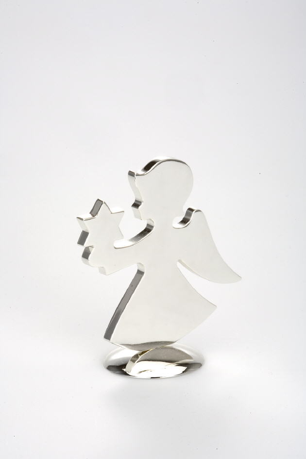 Deko Engel mit einem Stern in der Hand, aus versilbertem und anlaufgeschütztem Material. |
