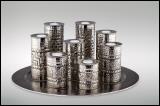 Teelichthaltergaritur inklusive Tablett aus vernickeltem Metall. Das Tablett hat einen Durchmesser von 53 cm. Die Garnitur beinhaltet 8 Teelichthalter mit folgenden Höhen: 2x 20 cm; 2x 17,5 cm; 2x 15 cm; 1x 12,5 cm; 1x 10 cm. 201,60 EUR