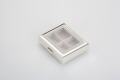 4-geteilte Pillendose mit Fenster, aus versilbertem, anlaufgeschütztem Material.