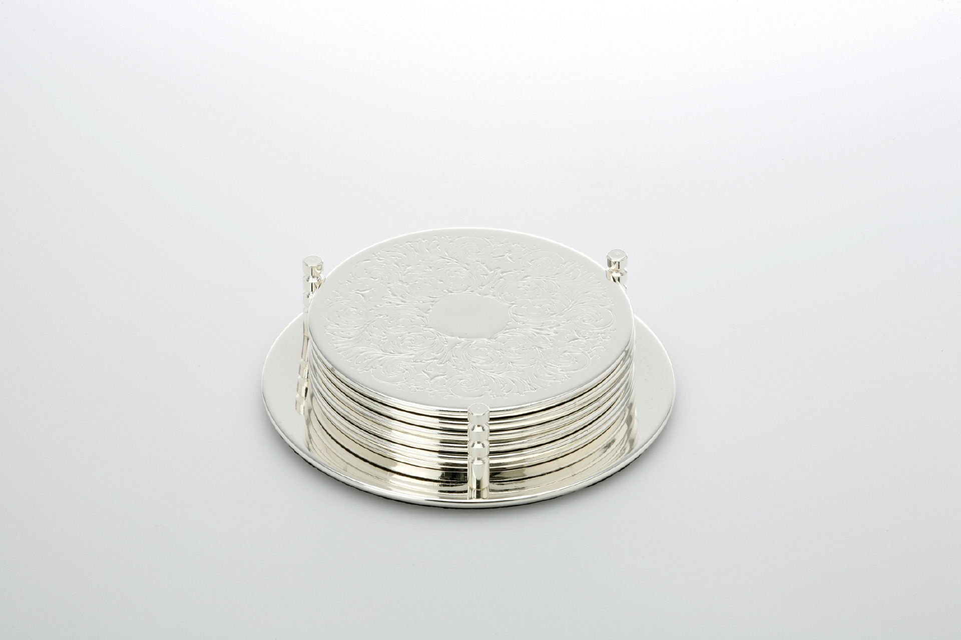 7 teilige, verzierte Untersetzer-Garnitur aus versilbertem und anlaufgeschütztem Material. Die Garnitur besteht aus 6 Gläsertellern und 1 Flaschenständer.