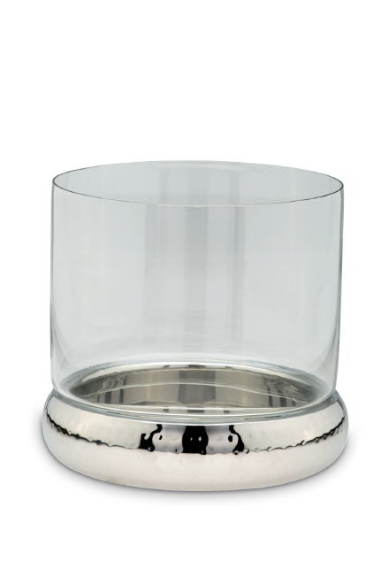 Windlicht aus Edelstahl in gehämmertem Design, mit abnehmbaren Glasaufsatz.